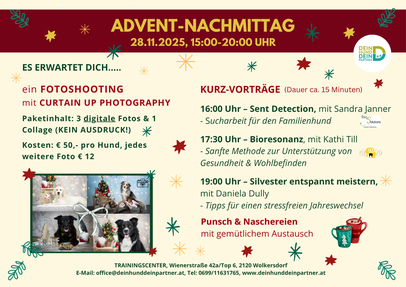 Ein stimmungsvoller Nachmittag erwartet dich: professionelles Fotoshooting, spannende Kurzvorträge und natürlich Punsch & süßes Schlemmern. Perfekt, um gemeinsam mit Hund & Familie die Vorweihnachtszeit einzuläuten.